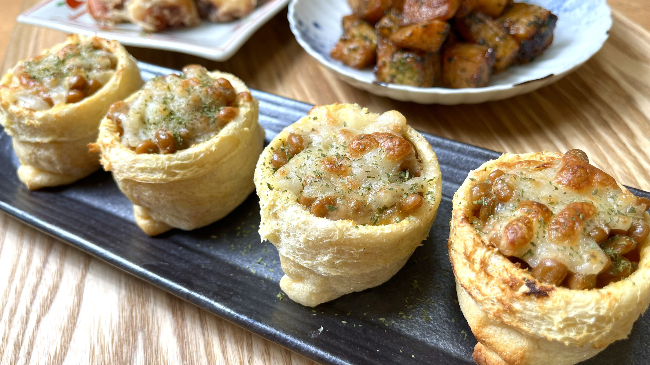 「外はカリッ、中はモチッ!たくあんの食感と納豆チーズが絡み合う、禁断の満足感。」