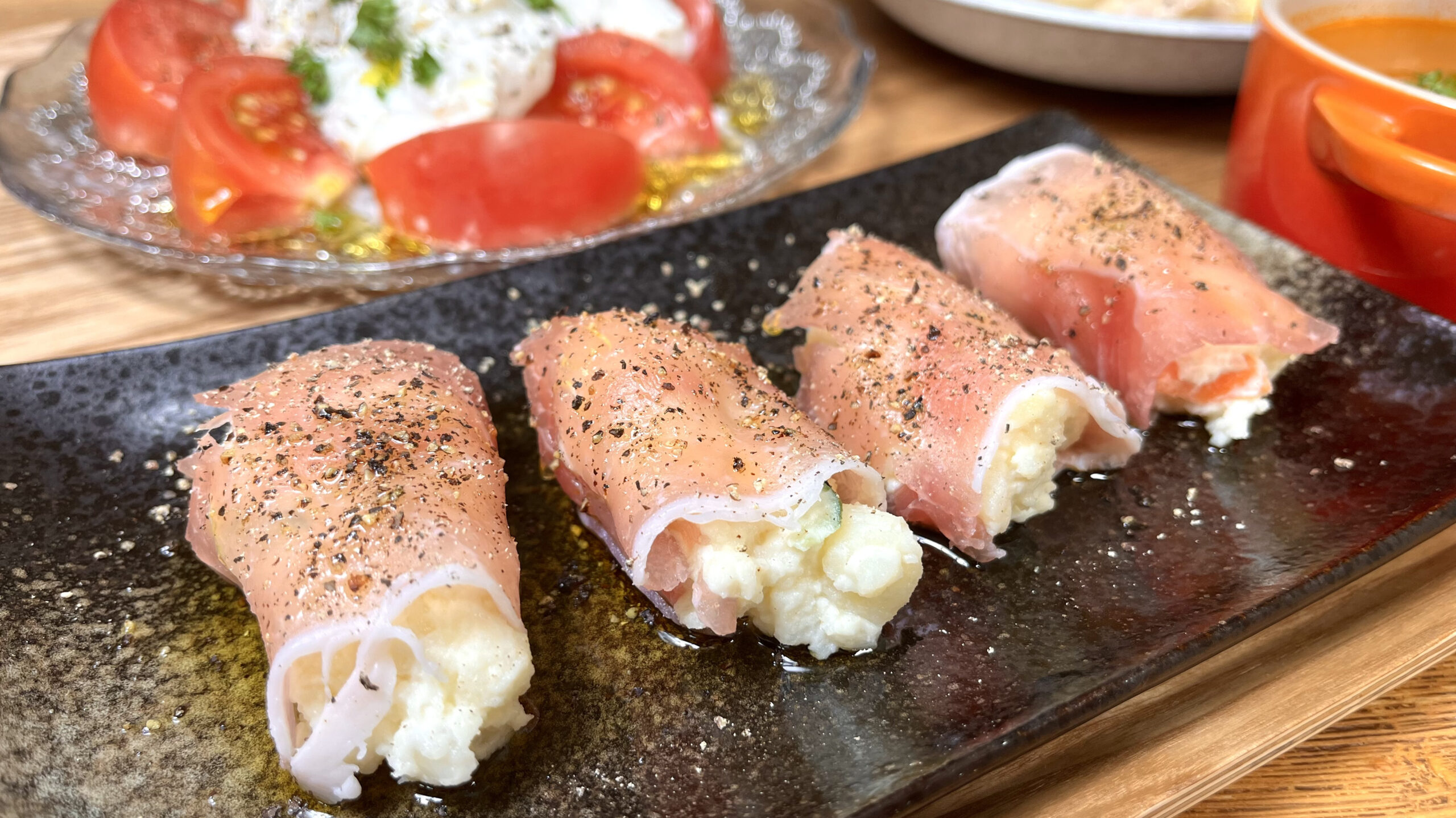 これ、一口でいっちゃってください!生ハムのしっとり感と、クリーミーになったポテサラが口の中で合わさって、もう最高に幸せな気分になりますよ。
