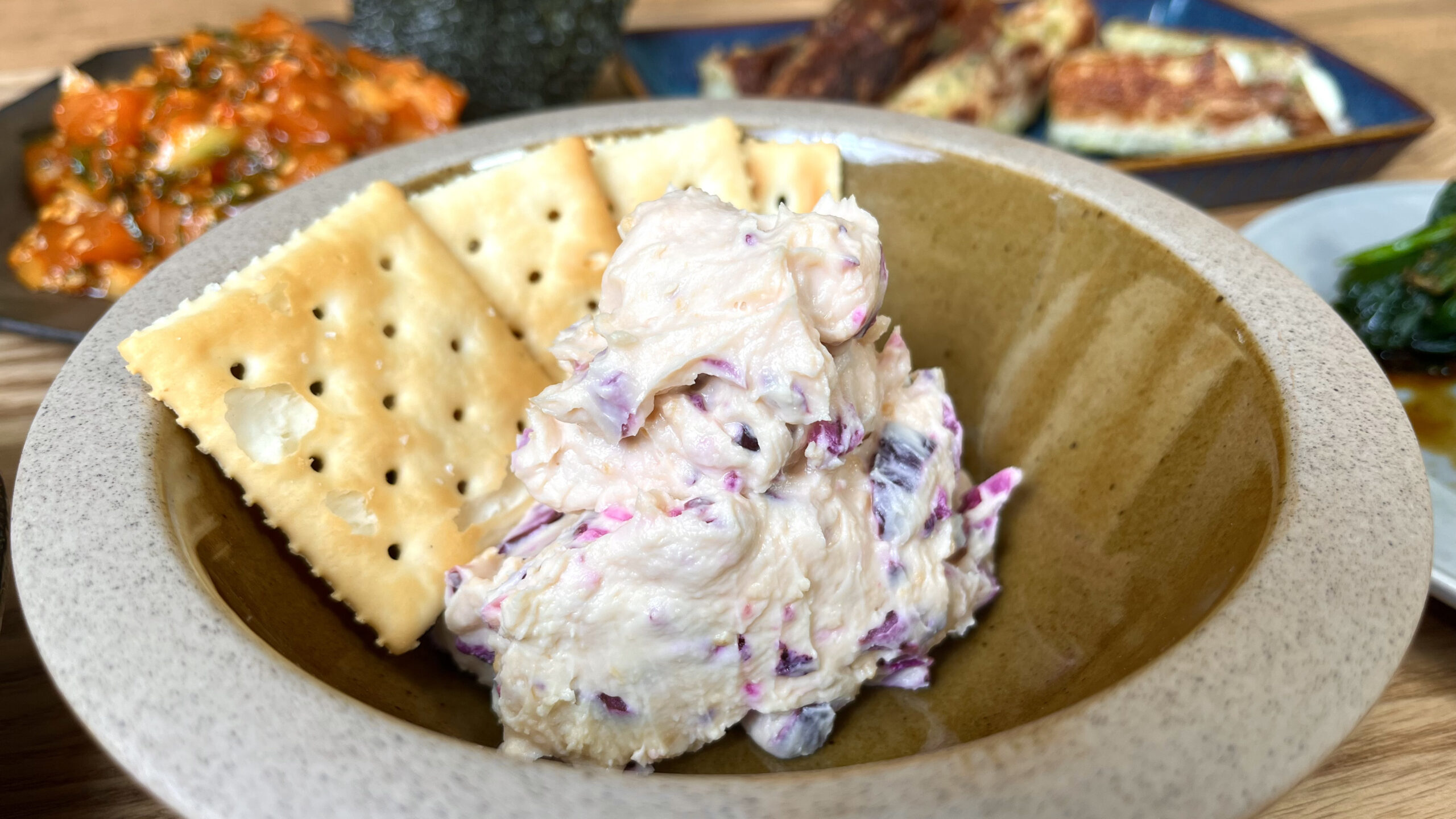 | 4. 【仕上げ】 器にディップを盛り付け、クラッカーを添えて完成。 |