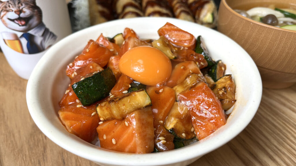 とろける旨みと香ばしさが重なる!極みダレの「サーモンと焼きズッキーニの黄金ユッケ丼」