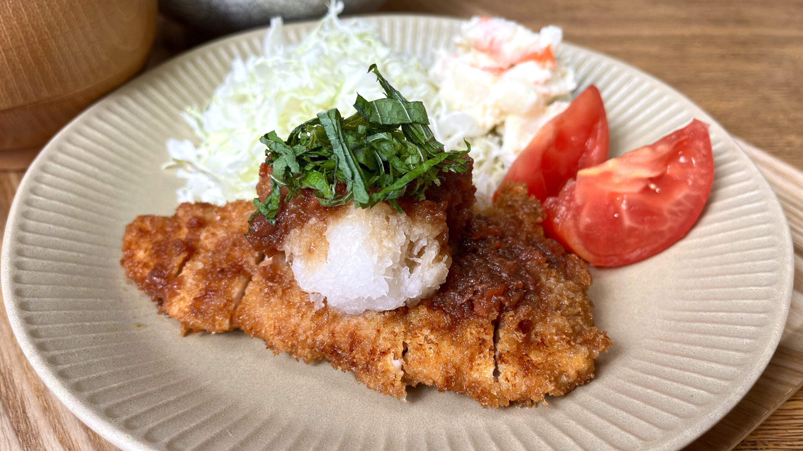 | 5. 【仕上げ】 器にカツを盛り、大根おろし、梅ソースの順に乗せ、青じそを散らして完成。 |